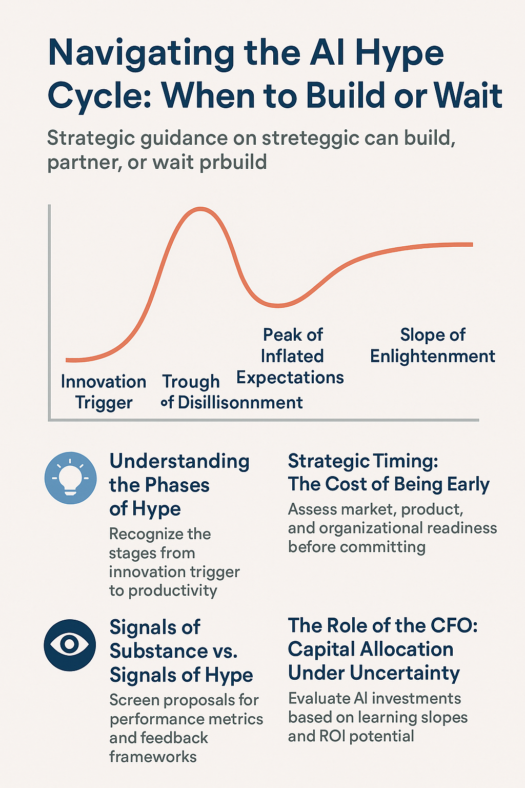 Leadership in a hype cycle is about time-boxing uncertainty, paying for compounding learning, and refusing theater. Build what you can refine. Partner for infrastructure. Wait when compliance or data quality lags.